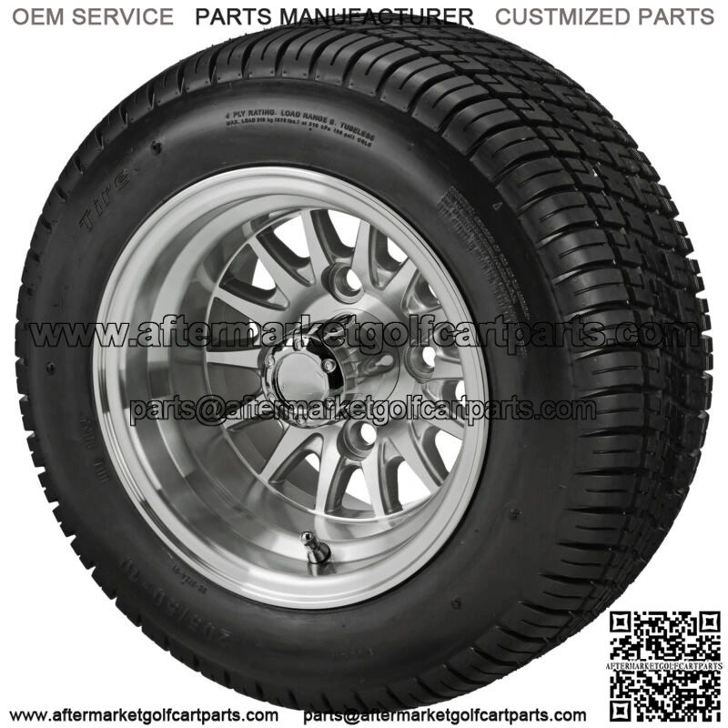 This 10″ golf cart tire & wheel is an example of the huge selection of golf cart wheels and tires available from RM Cart. This silver & machined wheel offers the right amount of bling for your cart. The 205/50-10 tire will fit on most any standard golf cart.