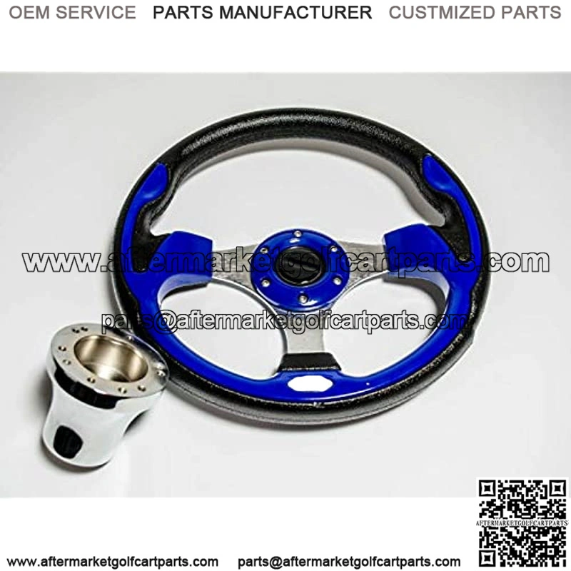: This Golf Cart steering wheel sports a Cobalt Blue with textured black outer grip and an aluminum brushed three-spoke center that will make you want to tear down the strip. We only try to make things more accessible with the 12.5-inch outside diameter. The horn button is for decorative purpose only and it is non-functional.