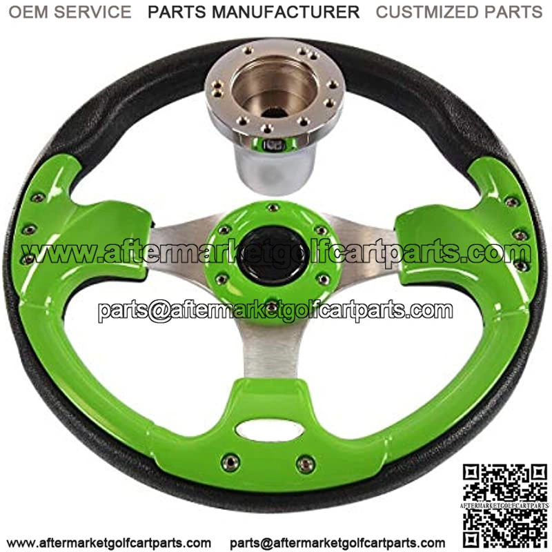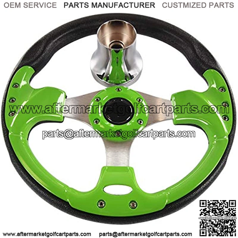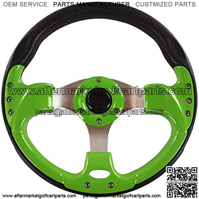 : This Golf Cart steering wheel sports a Lime Green with textured black outer grip and an aluminum brushed three-spoke center that will make you want to tear down the strip. We only try to make things more accessible with the 12.5-inch outside diameter. The horn button is for decorative purpose only and it is non-functional.
