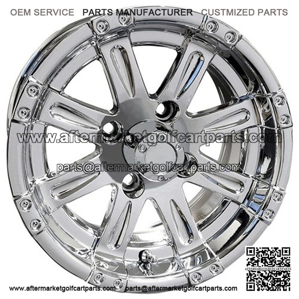 12″ Golf Cart Rim, Chrome Wheel & Center Cap, 12×6 Centered Specially designed for golf car use. Eliminates water sling and fender rubbing. Fits inside wheel wells. Aluminum wheels include center caps. Lug nuts sold separately. PRODUCT INCLUDES 1 RIM.