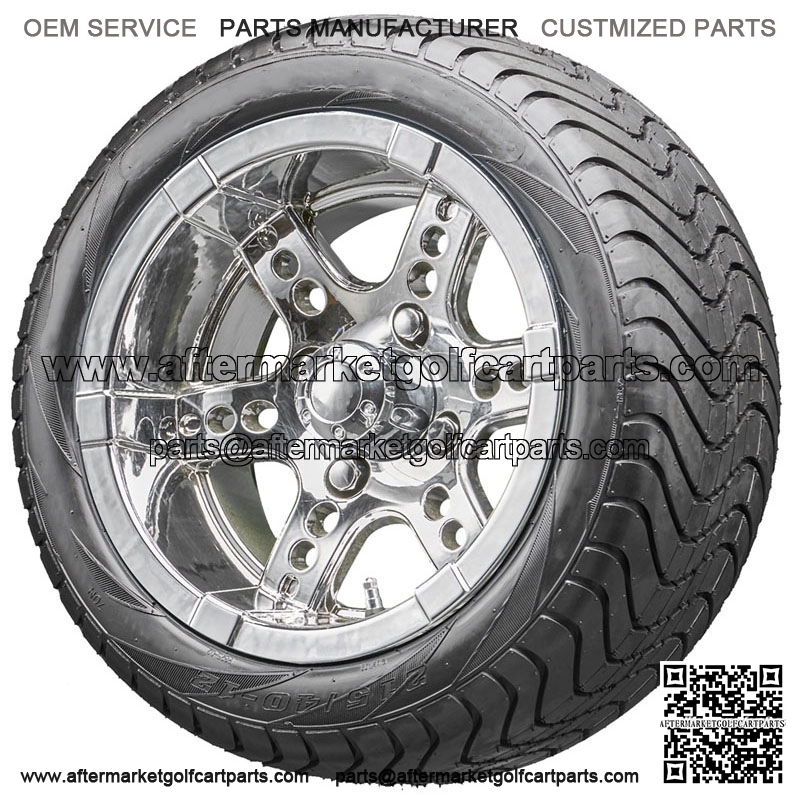 12” RX254 Chrome Wheels on your choice of Street Low Profile Tires Details: Set of 4 mounted golf cart tire and wheel assemblies 16 Chrome Lug Nuts 4 Center Caps Chrome RX254 Wheels 12×7 with 4×4 bolt pattern and ET-25 offset This combo will NOT require a lifted cart Tire Options: TIR-345 215/40-12 DOT 4 Ply TIR-372 215/35-12 DOT 4 Ply [$15] TIR-344 215/50-12 DOT 4 Ply [$30] TIR-342 225/55-B12 DOT 4 Ply [$75] 215/35-12 = 17.9″ Tall – 8.5″ Wide (fits all models) 215/40-12 = 18.5″ Tall – 8.5″ Wide (fits all models) 215/50-12 = 20.5″ Tall – 8.5″ Wide (fits RXV/TXT/Yamaha Drive without a lift) 215/55-B12 = 21″ Tall – 9.0″ Wide (fits RXV/Yamaha Drive without a lift) *Please select Standard (and Club Car) or Metric (Yamaha) Lug Nuts*