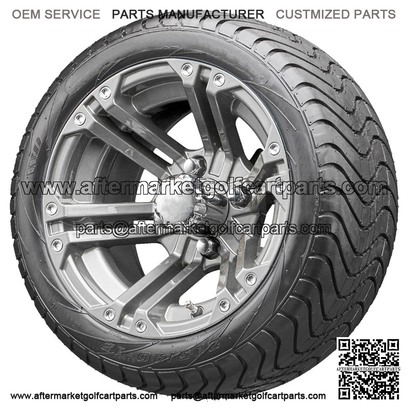 12” RX335 Gun Metal Gray Wheels on your choice of Street Low Profile Tires Details: Set of 4 mounted golf cart tire and wheel assemblies 16 Chrome Lug Nuts 4 Center Caps Gun Metal Gray RX335 Wheels 12×7 with 4×4 bolt pattern and ET-25 offset This combo will NOT require a lifted cart Tire Options: TIR-345 215/40-12 DOT 4 Ply TIR-372 215/35-12 DOT 4 Ply [$15] TIR-344 215/50-12 DOT 4 Ply [$30] TIR-342 225/55-B12 DOT 4 Ply [$75] 215/35-12 = 17.9″ Tall – 8.5″ Wide (fits all models) 215/40-12 = 18.5″ Tall – 8.5″ Wide (fits all models) 215/50-12 = 20.5″ Tall – 8.5″ Wide (fits RXV/TXT/Yamaha Drive without a lift) 225/55-B12 = 21.7″ Tall – 9.0″ Wide (fits RXV/Yamaha Drive without a lift) *Please select Standard (and Club Car) or Metric (Yamaha) Lug Nuts*