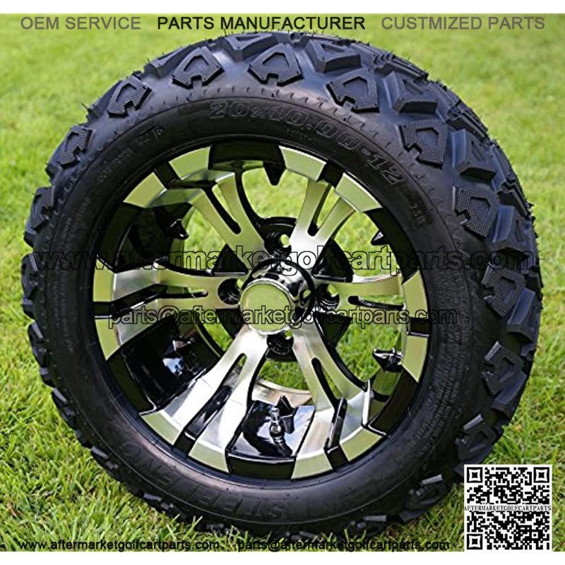 12″ VAMPIRE Machined/Black Golf Cart Wheels and 20×10-12 DOT All Terrain Golf Cart Tires – Set of 4 – NO LIFT REQUIRED (read description)