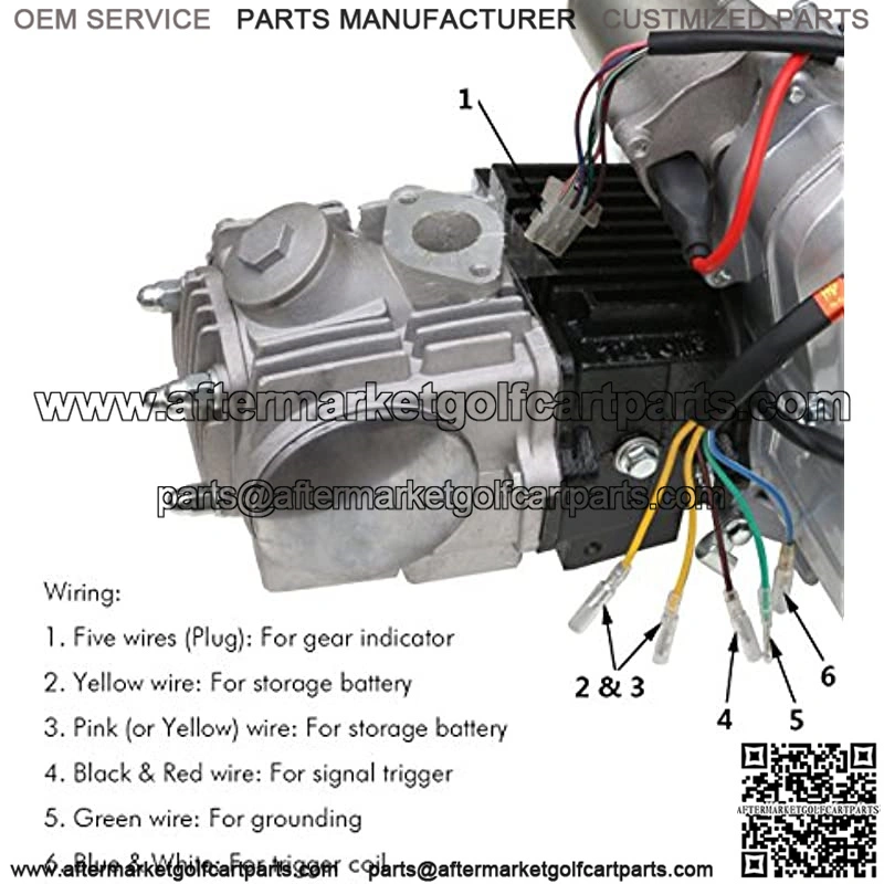 Wiring:1. Five wires (Plug): For gear indicator2. Yellow wire: For storage battery3. Pink (or Yellow) wire: For storage battery4. Black & Red wire: For signal trigger5. Green wire: For grounding6. Blue & White: For trigger coil