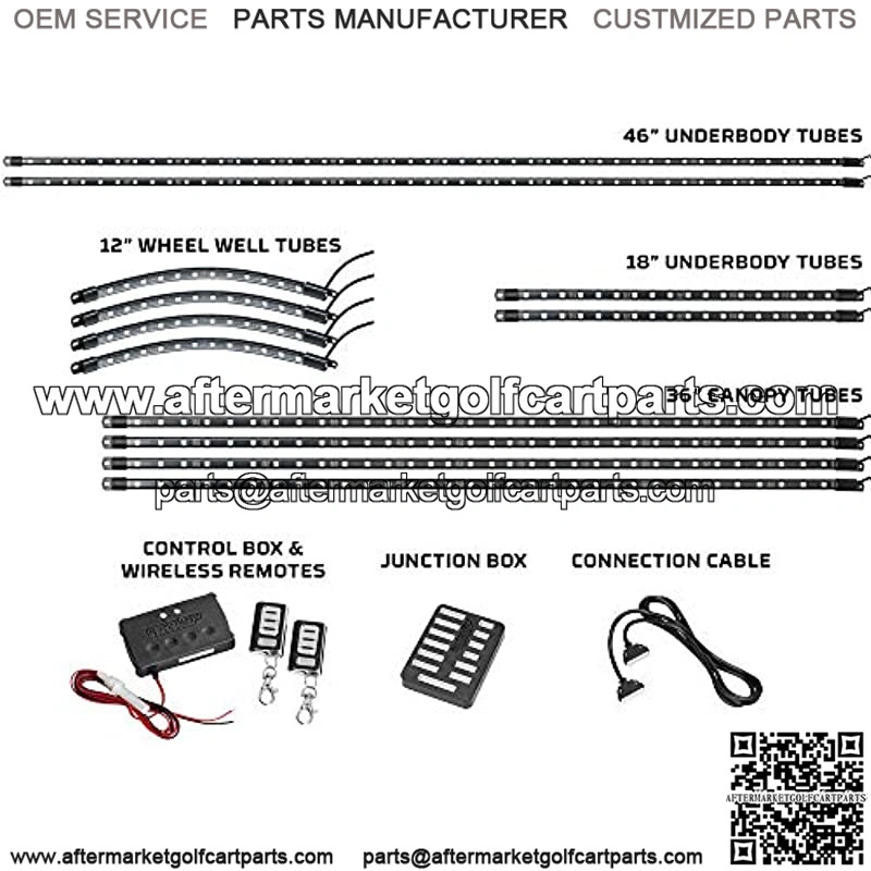 (2) 18″ Front & Rear Underbody Tubes(2) 46″ Side Underbody Tubes9Of Wire Per TubeSpotless Golf Cart Underglow