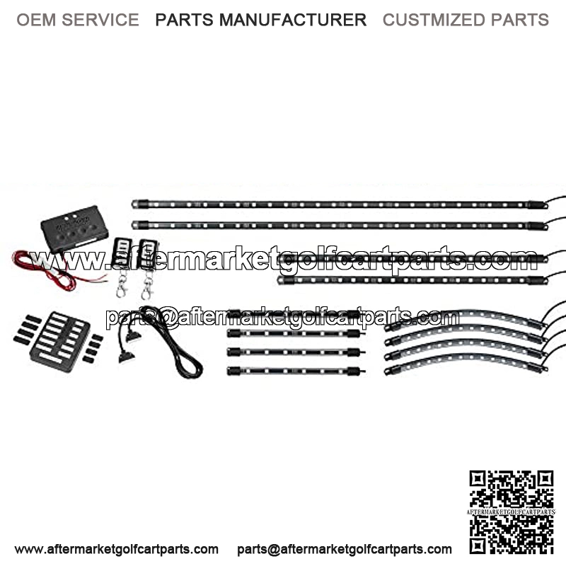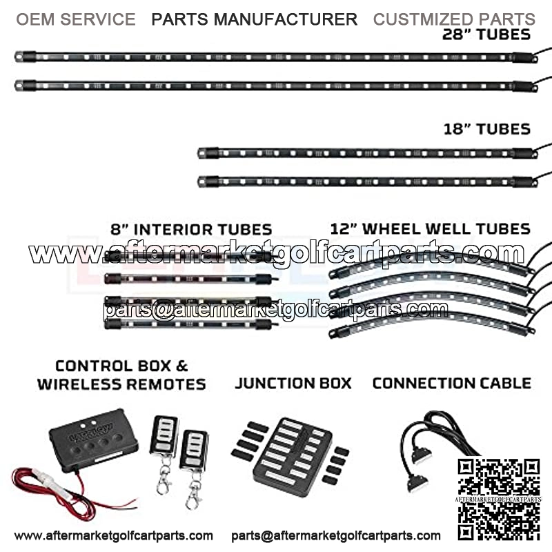 12pc Million Color SMD LED Golf Cart Underbody Kit Creates Vibrant Multi-Color Underglow, Wheel Well & Interior Accent Lighting that’s Compatible with Any Electric or Gas Powered Golf Cart 12-Volt Powered Control Box Features 10 Solid Colors, 3 Strobe Modes, 3 Fade Modes, 2 Flash Modes, Color Cycle Mode, Gradient Mode & Demo Mode – Solid Colors: Blue, Red, Green, Orange, Teal, Pink, Hot Pink, Purple, White & Yellow Includes (2) 28″ & (2) 18″ Flexible, Water-Resistant Underbody Tubes that House 84 SMD LEDs, (4) 12″ Wheel Well Tubes that House 48 SMD LEDs, (4) 8″ Interior Tubes that House 24 SMD LEDS, 12-Volt Powered Control Box, 2 Wireless Remotes, 12-Port Junction Box with 8 Port Plugs, Connection Cable, Self-Tapping Screws & Zip Ties Detailed Instructions to Walk Users Through the Installation Process Step-by-Step Guarantee with One Year Limited Warranty & Free Lifetime Technical Support