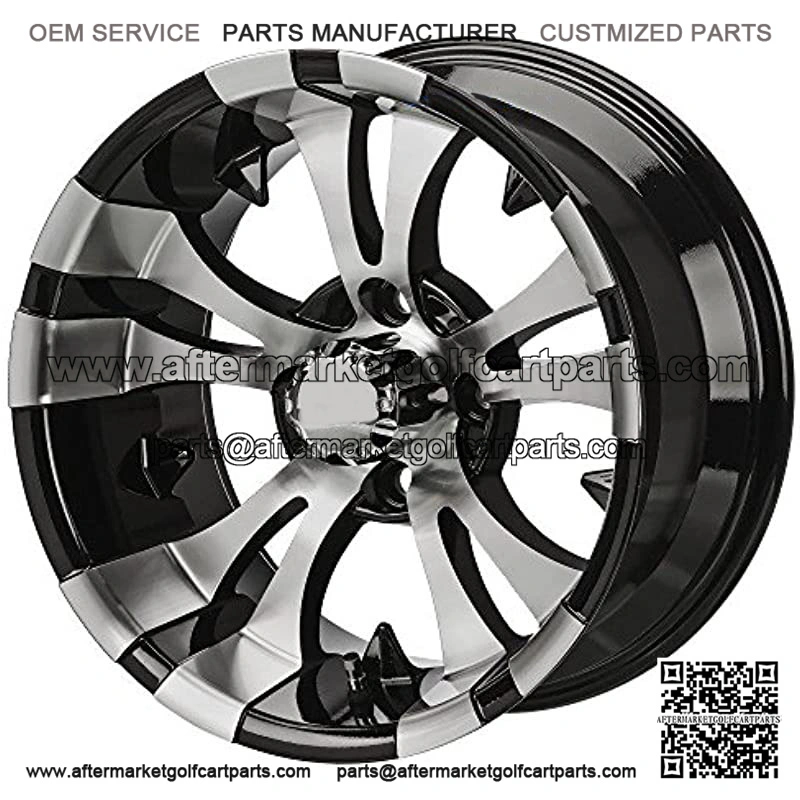 14″ Machined Black VAMPIRE golf cart. We wrap these beauties in our 23″x10-14 DOT All Terrain Golf Cart Tires to create the ultimate 14″ Wheel and Tire combo that will allow you to adventure with no limits! These wheels are extremely tough, and are only done true justice when seen in person.