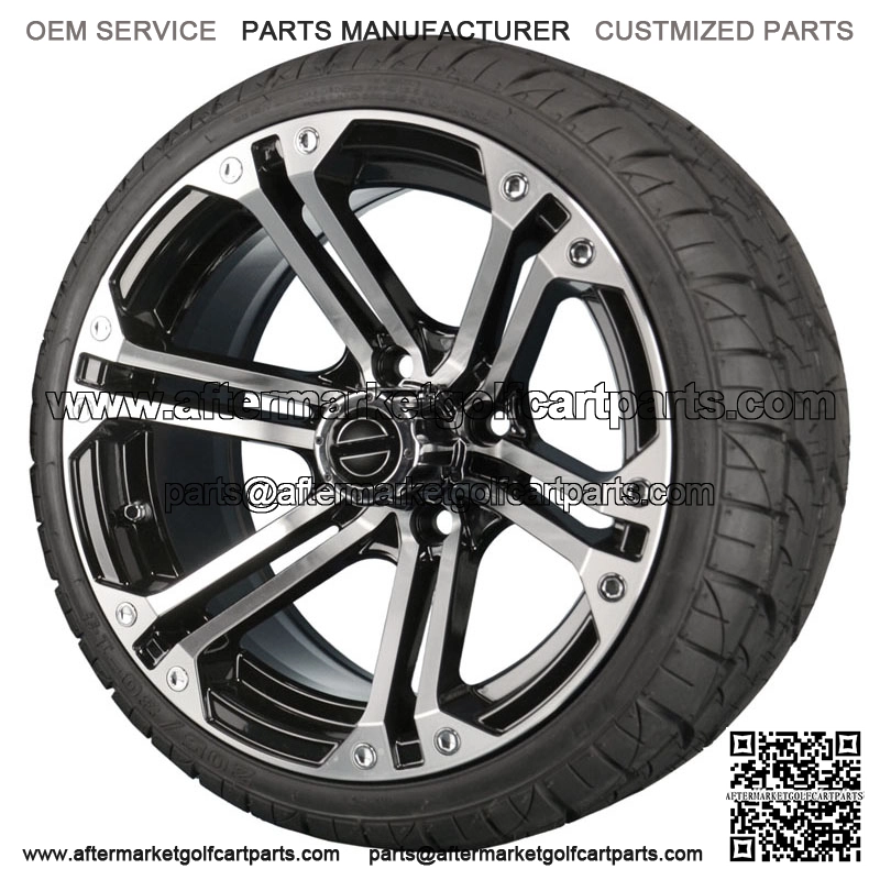 14” Machined Black Wheels on your choice of Street Low Profile Tires Details: Set of 4 mounted golf cart tire and wheel assemblies 16 Chrome Lug Nuts 4 Center Caps Machined Black Wheels 14×7 with 4×4 bolt pattern This combo will NOT require a lifted cart Tire Options: Arisun Cruze Street Low Profile Tires – 205-30-14 4 Ply MJCobra Street Low Profile Tires – 225-30-14 4 Ply (Additional $15.00) *Please select Standard (and Club Car) or Metric (Yamaha) Lug Nuts*