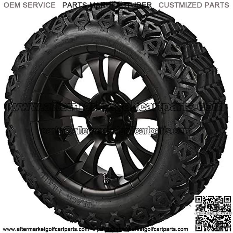Includes: (4) 14″x7″ VAMPIRE MATTE BLACK Golf Cart Wheels (5-Spoke new style!), (4) 23×10-14 DOT Approved All Terrain Golf Cart Tires, (4) Black “SS” Center Caps, (4) Sets of Black Lug Nuts