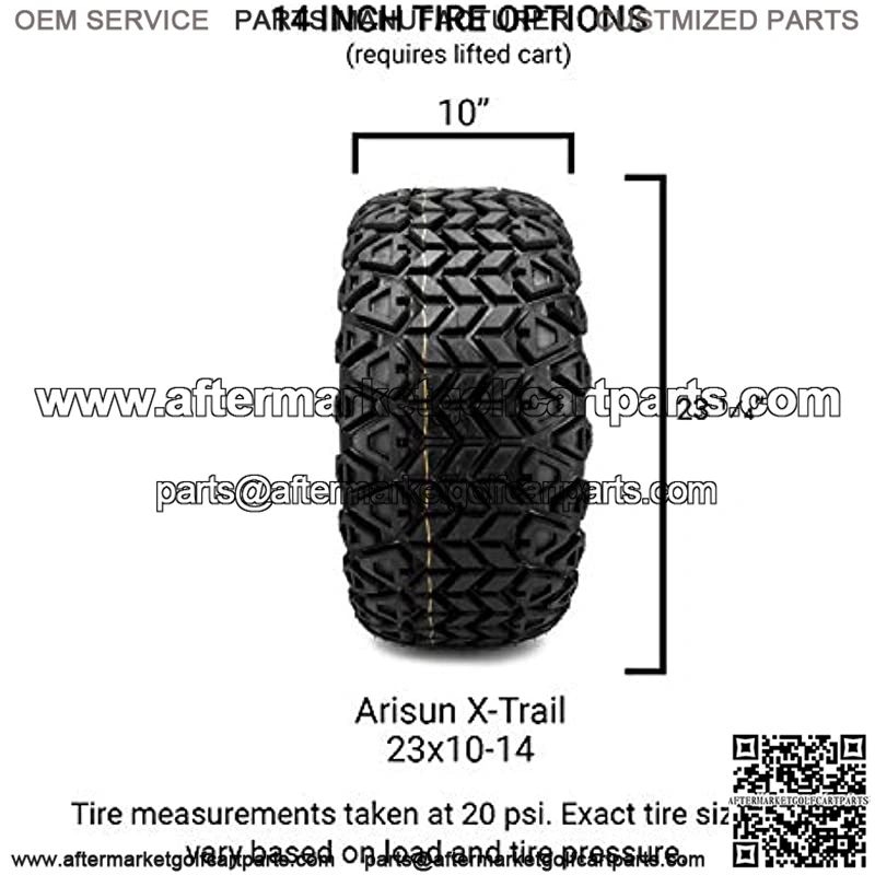 This listing is for (1 tire, set of 2 tires, or set of 4 tires) 23×10-14 “X-Trail” Tire for lifted golf carts. makes OE tires for popular ATV manufacturers including Polaris. works closely with one of the largest tire manufacturers in the world.