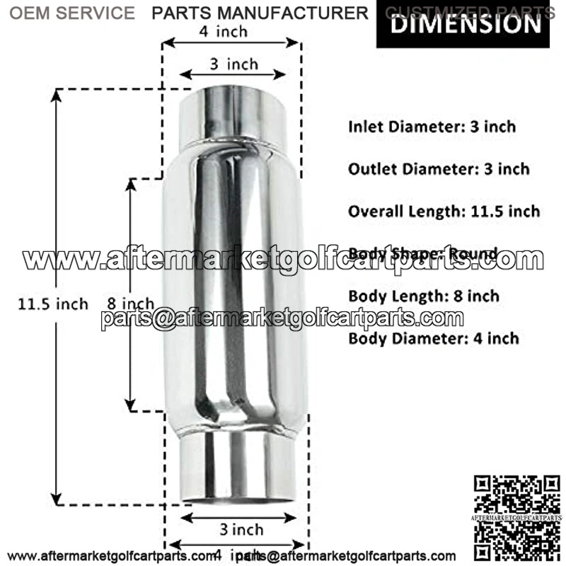 DIMENSION – Inlet Diameter: 3 inch, Outlet Diameter: 3 inchOverall Length: 11.5 inch, Body Shape: Round, Body Length: 8 inch, Body Diameter: 4 inch