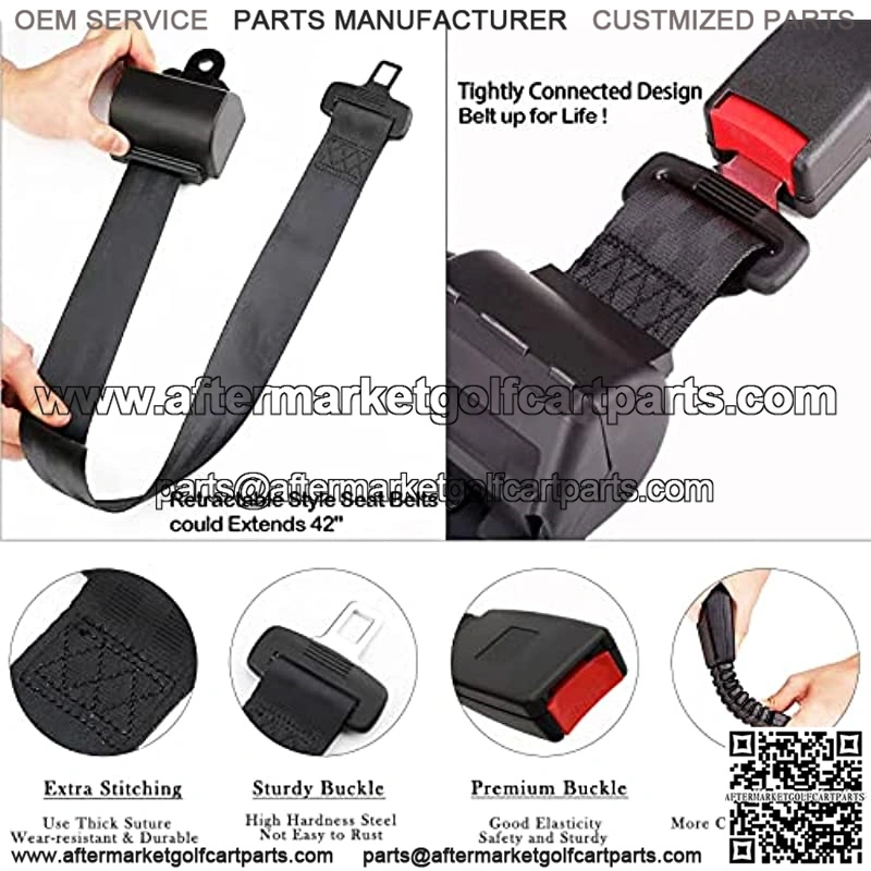 Features and Benefits: With seat belts kit, there are no drilling holes needed. Designed to work on front and rear seat without multiple brackets. 42 inch long retractable Belt length can fit most users well. Easily buckle and unbuckle design, more flexible and sturdy. Upgraded 3 holes Black iron sheets design suits for more golf carts.