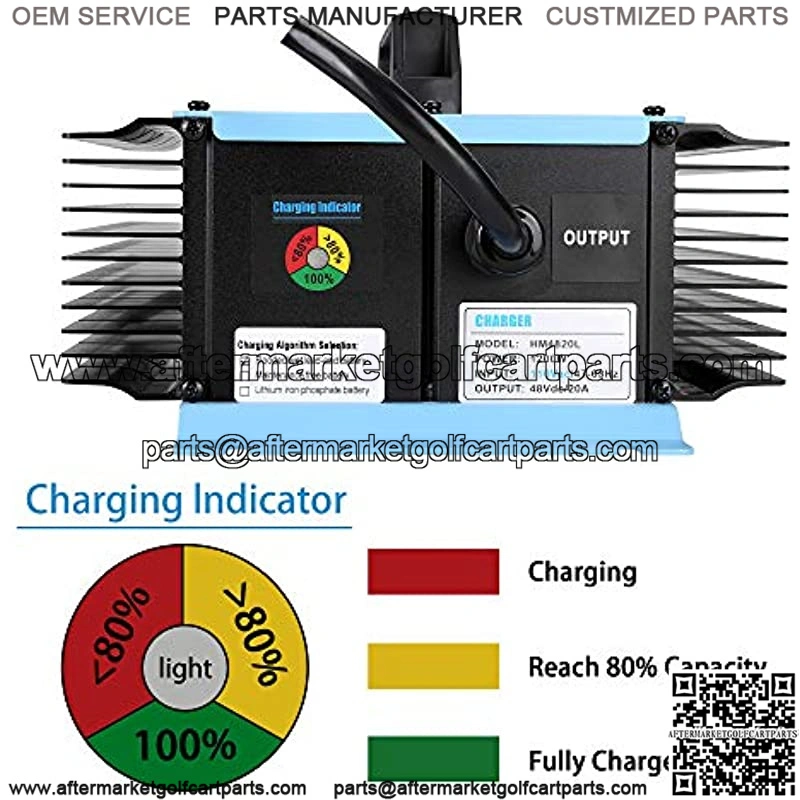 High -Performance ChipAs a critical part of this golf cart electric charger, 48V 20A golf cart battery charger with international standard IT chip can ensure your fast charge, and it can achieve high output stability, charging faster (20A) and more accurately than conventional chargers. Suitable for 3 Types of Batteries48 volt golf cart Yamaha G29 charger is s an intelligent battery charger, it has three charging algorithm,Which can be selected according to the type of battery: 1)Flooded/wet Lead-acid Battery; 2)Maintenance Free Battery; 3)Lithium Iron Phosphate Battery.(PLS NOTE: Confirm the BATTERY TYPE before use) Safe To Charge & Operate Yamaha intelligent battery charger with 5 main protections: over-temperature protection, short- circuit protection,over-voltage protection, Timing shutdown protection, reverse polarity protection, and smart charge mode all make this Yamaha G29 battery charger safe & reliable to operate. Intelligent MCU Control Charging20A battery charger for Yamaha it can automatically realize multistage charging:constant current, constant voltage, etc. It has multiple protection functions Aluminum Housing and Heat-dissipation DesignYamaha 48V charger made in high-quality aluminum shell to make this club car battery charger golf cart sturdy and durable to use.The heat sinks on both sides of the golf cart charger Yamaha can achieve a great heat-release effect, greatly extending this golf cart charger’s operating life.