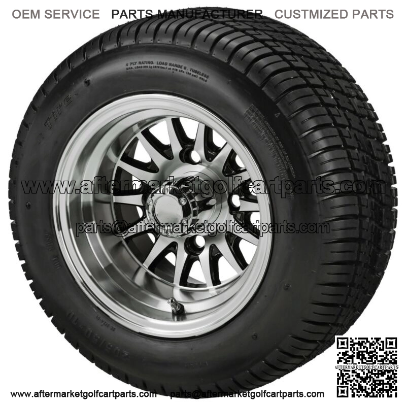 BRAND NEW – Set of 4 205/50-10 4 Ply DOT Low Profile Golf Cart Tireon 10×7 Machined/Black 14-Spoke Wheel Aluminum Wheel(includes 16 Chrome Lug Nuts) Set of 4 Includes:4- 14-Spoke Wheel 10″ Machined/Black Wheels4- 205/50-10 DOT Tires4-Snap-In SS Center Caps16-Lug NutsTires and Wheels all come Mounted by Professional Mounters