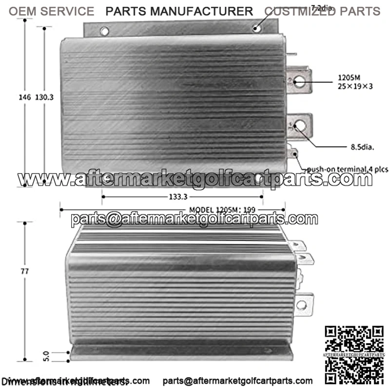 Key Features: For CURTIS Model 1205M-5603 Norminal Battery Voltage (Volts): 48V (default setting) or 36V1 Minute Current Rating (amps): 5005 Minute Current Rating (amps): 3501 Hour Current Rating (amps): 200Plug Braking (A2 Busbar): YesPWM operating frequency: 15.6 kHzLogic input current: < 2 mAStatus LED output current (max.): < 2 mATen throttle types can be used with these controllers:Type 0: 2-wire potentiometer, 05kType 1: 2-wire potentiometer, 5k0 Type 2: single-ended 05V input Type 3: 2-wire potentiometer, 4.6k0 Type 4: 2-wire potentiometer, 5.5k0 Type 5: 2-wire potentiometer, 1k0 Type 6: ITS input Type 7: single-ended 6.310.6 V input Type 8: single-ended 612 V input Type 9: single-ended 3-wire potentiometer, 05k