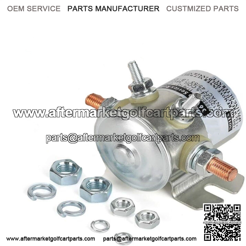 36 Volt 4 terminal SPNO heavy-duty solenoid for EZGO TXT / Marathon 1980-2010 electric golf cart.- Replaces part#: 70-120224, 11761GA, 11761-G1, 27855-G01, 27855-G02, 3016, 31680-G1, cole hersee 24080.- Acts as the conduit between the golf car battery and starter motor, provides the electrical energy necessary to activate the vehicle’s ignition system.- Make sure your small diode is in the correct direction with the line pointing to the positive side.- Same as original solenoid, the base must be fixed when assembling, clamping the ends of the wires between inner and outer nuts.