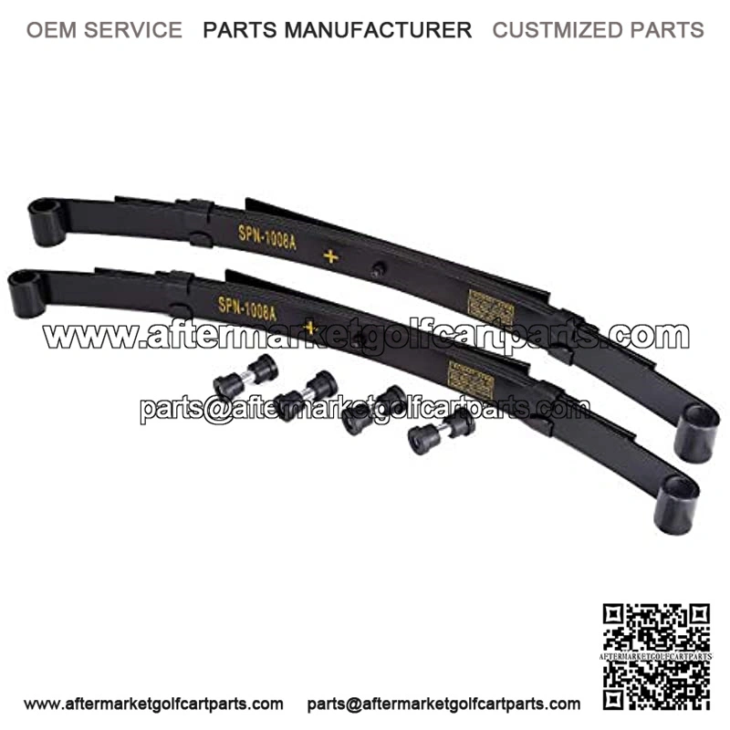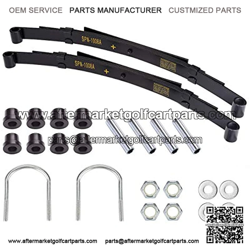 Item: Golf Cart Heavy Duty Carbon Steel Rear Leaf Spring Bushing Kit, Set of 2Works for: All Gas & Electric golf cartsLeaf spring type: 4-Leafs per springReplaces: OEM (manufacturer) or any old sagging leaf springs on golf cartsPackage Include:2* Heavy Duty Rear Leaf Springs(4-Leafs)4* Metal Spacers8* Urethane Rubber Bushings