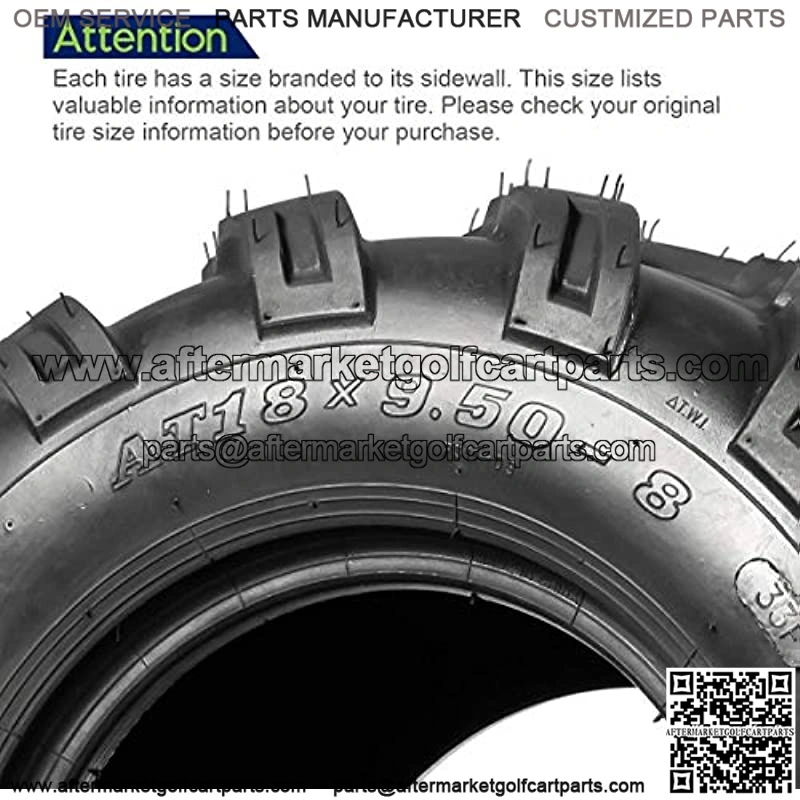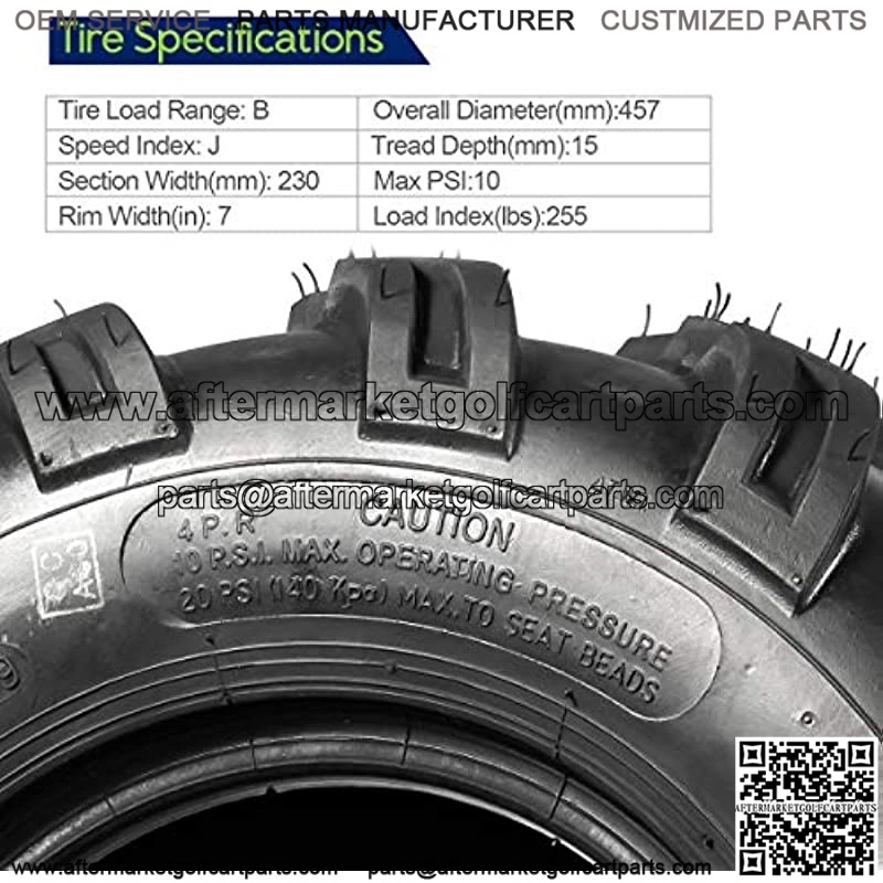 Size:18×9.50-8 ATV Tire; Tread Depth: 15mm, Rim Width: 7.00″, SW (mm): 230, OD (mm): 457, Max Loads (lbs): 255, PSI: 10