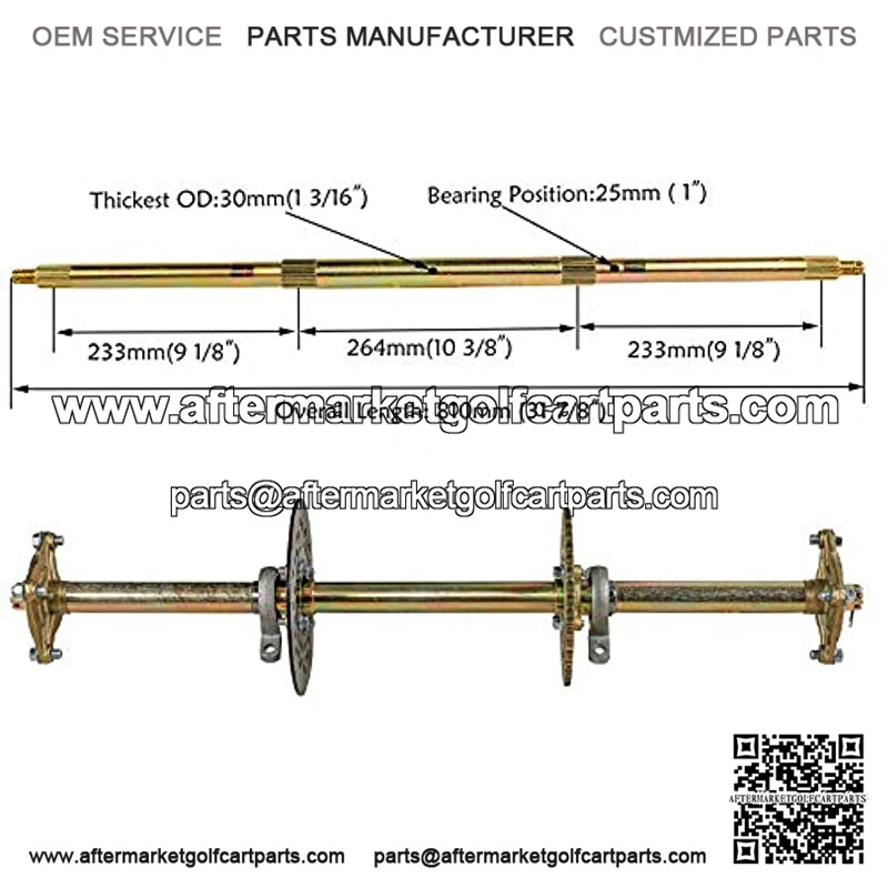 Overall length 32 inch (810mm), 1″ in diameter and the thickest part of the axle is 1 3/16″ (30mm)