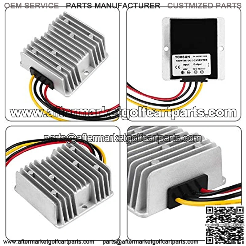 Input Voltage: 48V nominal, Input range: 40V to 60V ; Output Voltage: DC 12V 10A 120W High conversion efficiency, Maximum Efficiency: 95%; Ripple Wave: 50Mv; Starting delay time: 2S Over-current /Over-load /Low-load /Short-circuit /Over-heat intelligent protection Compact aluminium shell with epoxy potting, 100% waterproof, anti-dust, anti-shock protection and better heat dissipation Widely used to golf cart, motor, speaker, GPS, LED car display screen, air-conditioner, electric fan, solar energy, photo-voltaic power, DVD, industrial equipment ect.