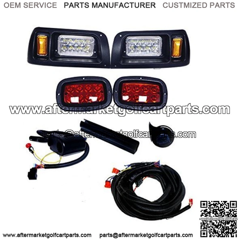 . Includes (1) Deluxe LED Light Kit wrap around . Fits Club Car DS Golf Carts 1993 & up . Includes 2 LED head lights, 2 tail lights, wiring harness with all connectors and push/pull switch, turn signal switch & horn (This light kit contains a brake pedal pad, not a brake switch)** . Mounting hardware and installation instructions are included . Cut out template included . Measurements: Outside bezel: 5 1/4″ x 12 1/2″ Inside bezel: 3 1/4″ x 8 1/4″ . Street Legal . 48V systems will require voltage reducer. (NOT INCLUDED)** . Some factory installed headlights cannot be replaced with anything other than OEM lights .