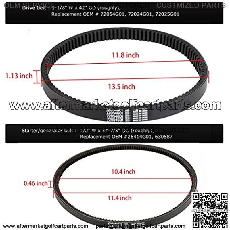 Golf carts drive & starter belts kit for EZGO 4 Cycle Gas Golf Cart 1994-UP replacement for OEM #72054G01, 26414G01. Will not fit carts with Kawasaki engines, Marathon, and ST480 ST4x4 & RXV models.
