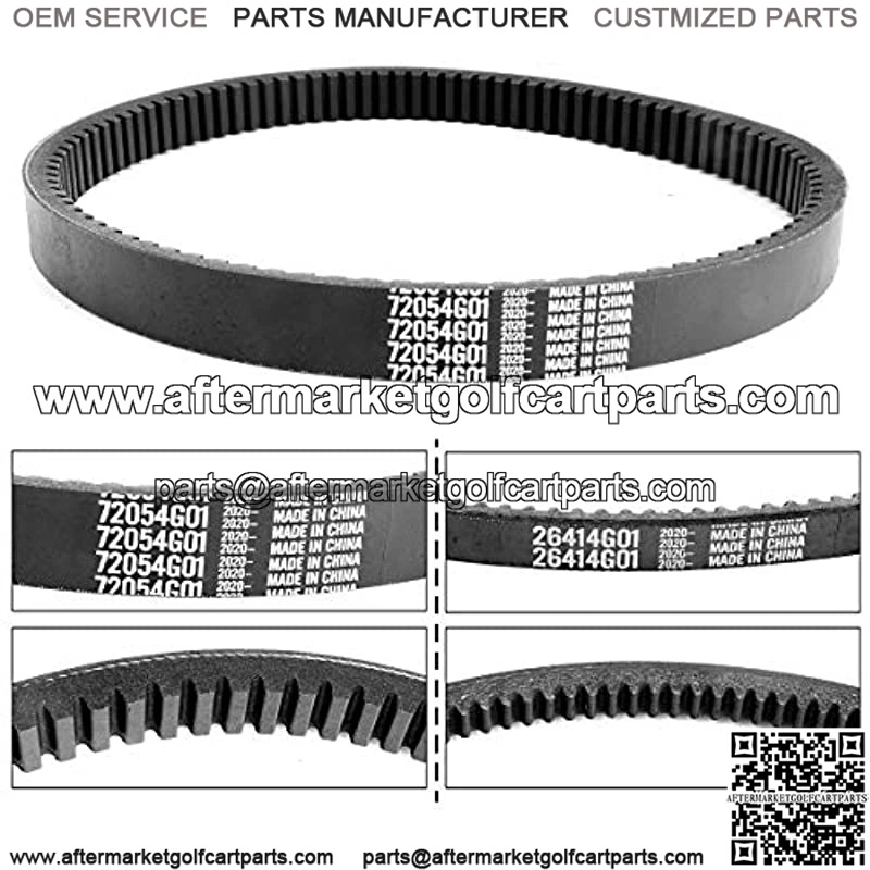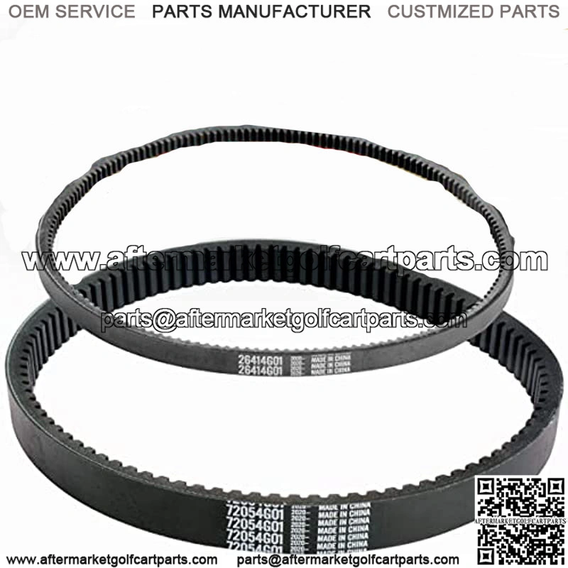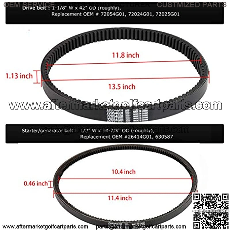 Golf carts drive & starter belts kit for EZGO 4 Cycle Gas Golf Cart 1994-UP replacement for OEM #72054G01, 26414G01. Will not fit carts with Kawasaki engines, Marathon, and ST480 ST4x4 & RXV models.Tipsupgrade the packaging.So the package will be shipped randomly.Whether the package is new or old, the product inside is the same. Drive Belt – 1-1/8″ W x 42″ OD (Roughly)replacement OEM # 72054G01, 72024G01, 72025G01 Starter/Generator Belt – 1/2″ W x 34-7/8″ OD (Roughly)replacement OEM #26414G01, 630587 Package include 1x Starter Belt, 1x Drive Belt It is necessary to check the belt for Every year , the belts can dry rot and tear over time, A worn belt will slip is very dangerous during the driving process. So Require Replacing To Ensure Your Golf Carterformance.