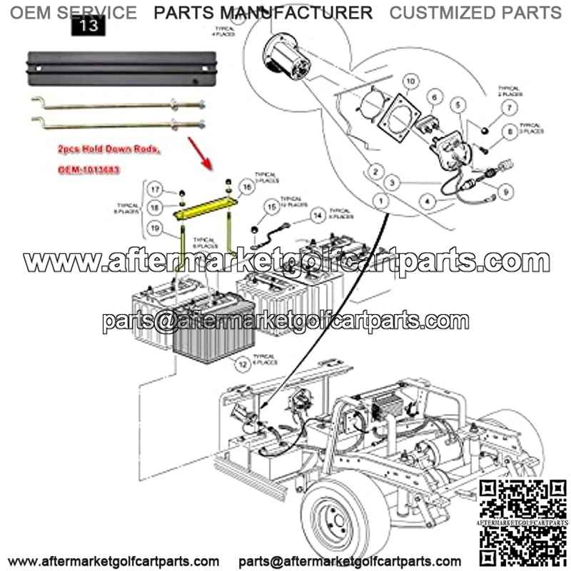6pcs Hold Down Rods, Replaces club car OEM:1013683.Package content:3 x Battery Hold Down Plate , 6 x Battery Hold Down Rods&Washers & Nuts.