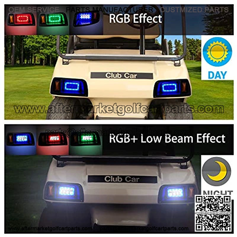 Golf Cart Deluxe LED Light Kit for with RGB Headlight Daytime Running Light Low High Beam Turn Signal Function1.This complete light kit Provide you bright vision in night. 2.Make you more safty in fog or rainy day when driving outdoor for headlight with Daytime Running Lamp. 3.The DRL with multi-colorful mode controlled by music after down load App in our user manual.Application: The latest LED headlight and tail light kit fits Club Car DS gas and electric golf cart Warm reminder: Input voltage 12V-80V (connect to the battery directly, no voltage reducer needed)Package include: 2x LED headlights, 2x LED Tail lights, 1x Harness, 1x universal light upgrade kit with turn signals switch horn brake pad switch Harness