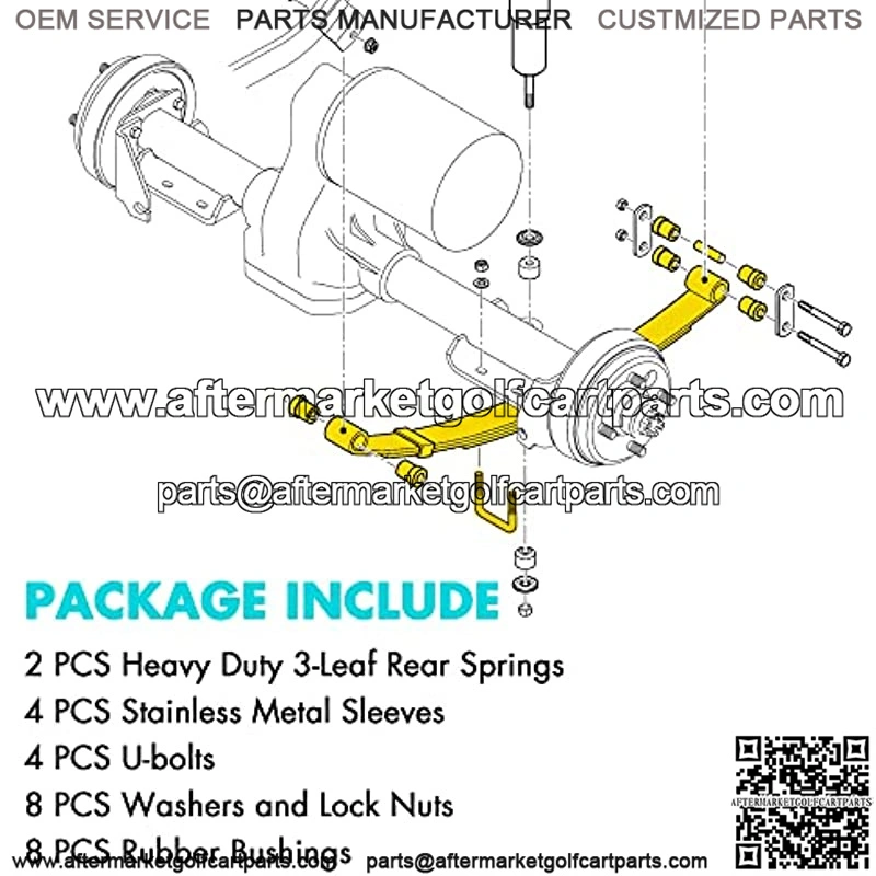 Package Include2 * heavy duty leaf rear springs, 4 * stainless sleeves,8 * rubber bushings, 4 * U bolts with 3/8″ washer and lock nut.