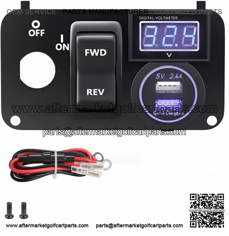 ‘- Golf Cart Key switch console plate panel kit for EZGO TXT & PDS 2003-up electric golf cart;- Console plate reserved hole for original key switch, replaces plate OEM 73030G01 73030G02 73030G05 73030G06;- Come with FNR forward & reverse switch, replace OEM 74323-G01;- Come with LED digital voltmeter, displays the voltage in real time, reminds you whether the voltage is normal;- Come with dual USB 3.0 charger socket, DC 12V input, 5V 2.4A + 3.1A output for fast charging phones, tablets, GPS and other devices- This Console Panel fits EZGO PDS (precision drive system) dash but not for DCS system.- The USB charger accepts only DC12V Input,if your cart is 36V/48V, you may need a voltage reducer. ( Not include and Sold separately);- Regard installation,just pop out the existing panel,replace the ignition switch,then connect all wires to the entire battery pack. Red wires to positive post, black wires to negative post.