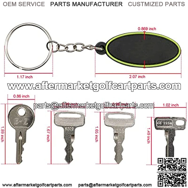 Golf Cart Key Set (4PCS) for EZGO, Yamaha, Club Car Golf Cart OEM# 1X 17063-G1 EZGO key; 1X 1012505 Club Car key; 1X JU2-H2511-00 YAMAHA key; 1X 8002 JU6-H2511-10 Yamaha key; 1X Soft PVC Keychain YSK-0004( Includes key tag with the key models listed on the back);