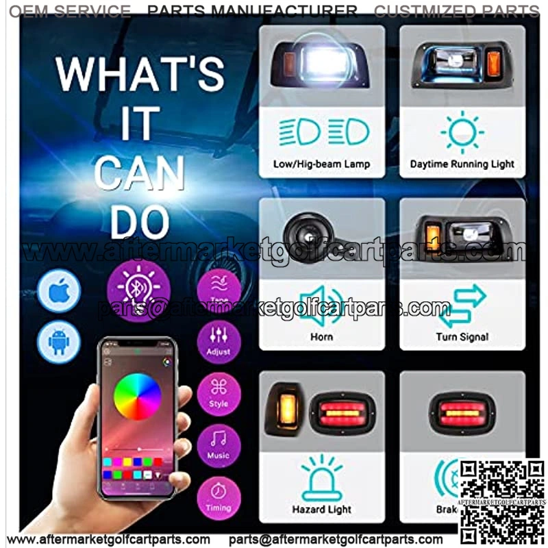 Package included : golf cart LED light kit AND golf cart universal deluxe light upgrade kit. 2x LED head lights, 2xLED tail lights, turn signals and switch, horn, brake lights, harness hardware and instruction.