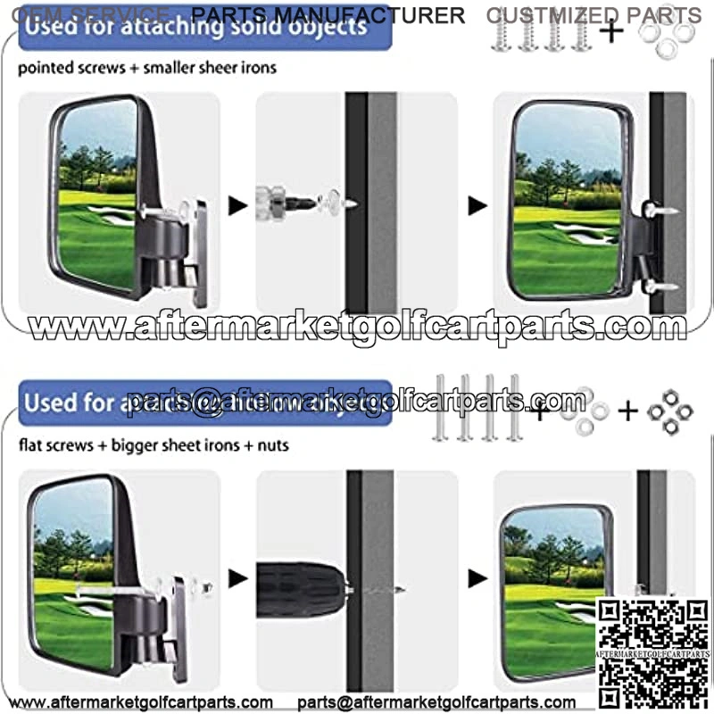 Our golf cart folding side mirrors are easy to adjust up & down or sideways for the desired visual angle.Also can fold in for easy parking and storage. Comes with the big bottom screws, you can adjust the tension of the mirror.