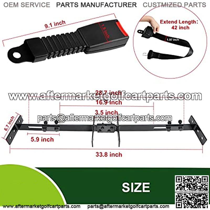 DimensionBracket size: 35″ x 6.9″; Retractable Belt length: 42″. From end to end with the male attachment connected to the female, the belt is 47.64″.