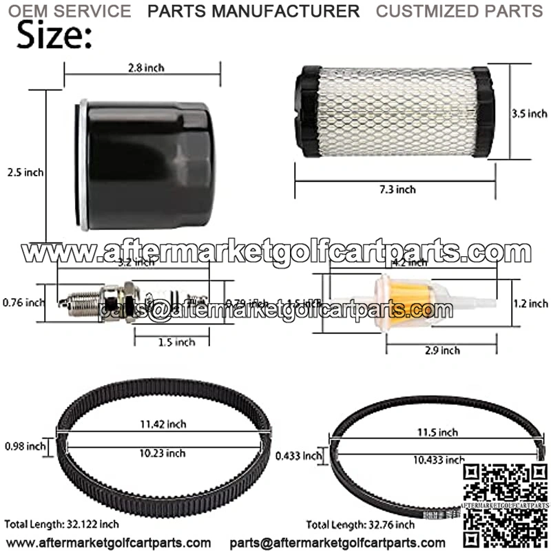 Tune Up Kit & Drive Belt Starter Gen.Belt fit for EZGO RXV TXT 4-Cycle 2008-2011 w/ Kawasaki Motor and clutch; Golf Cart Tune Up Kit repalce OEM of EZGO: FIL-1007,FIL-1027, 611879 , 2147; Belts Replace OEM# Drive Belt 606136 (DRIVE BELT WILL NOT FIT TEAM CLUTCHES) & Starter Generator Belt # 606138; Pls check the made year,OEM No and model of your golf cart before purchasing. Also knowing the make of the engine and the clutch is equally important; Package Included: One set Tune Up Kit (1 x Air Filter, 1 x Fuel Filter,1 x Oil Filter, 1 x BPR2ES Spark Plug),1x clutch drive belt,1x starter generator belt.