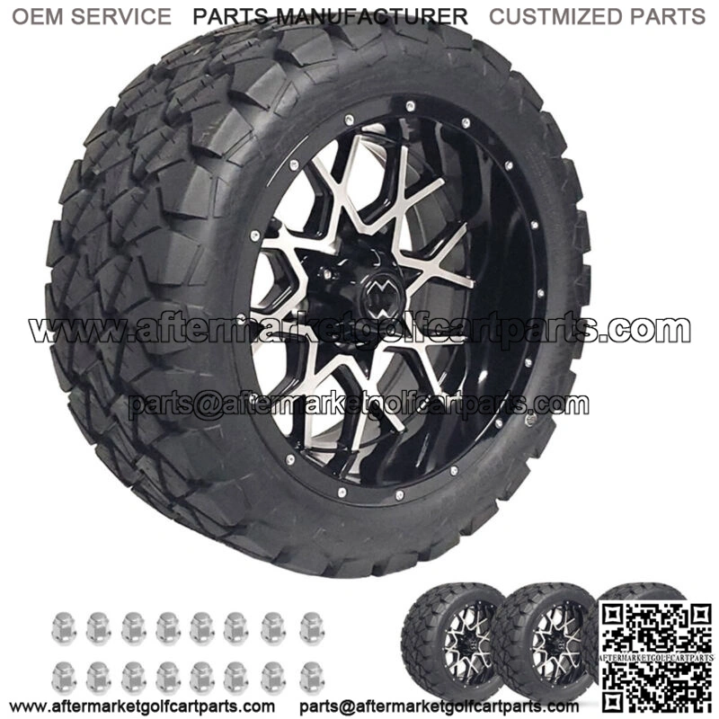 Golf Cart Wheels 14″ CHAOS Machine/Black on 22″ A/T Tires Carts Set of 4