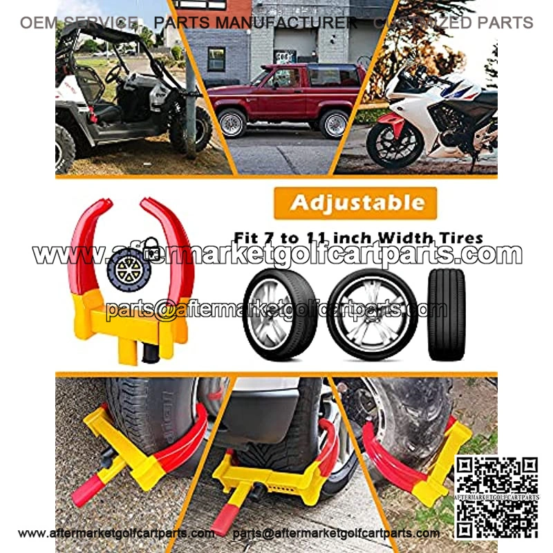 DESIGNED FOR MOST VEHICLEThe nine holes design of Wheel lock can be adjusted to fit 7 to 11 inch width tires for cars,campers, trucks, trailers ,motorcycles, ATV’s, golf carts,SUV etc.
