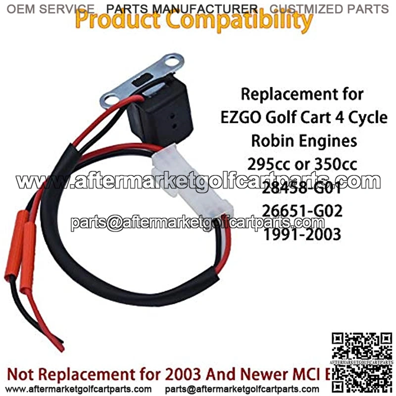 Part Type: Pulsar Coil.Replacement for EZGO Golf Cart Robin Engines 4 Cycle 295cc or 350cc (Pre-Mci models only) 1991-2003.Replacement for part number: 28458-G01 26651-G02.Special Notes: This coil will not Replacement for the EZGO Workhorse ST 480, the ST 4 x 4, the Cushman 4800 Commander, or 2003 and newer MCI Engines.Package includes: 1x Ignition Coil & 1x Harness & 2x Connecting Glue.Please ensure this is the correct part for your engine before ordering.