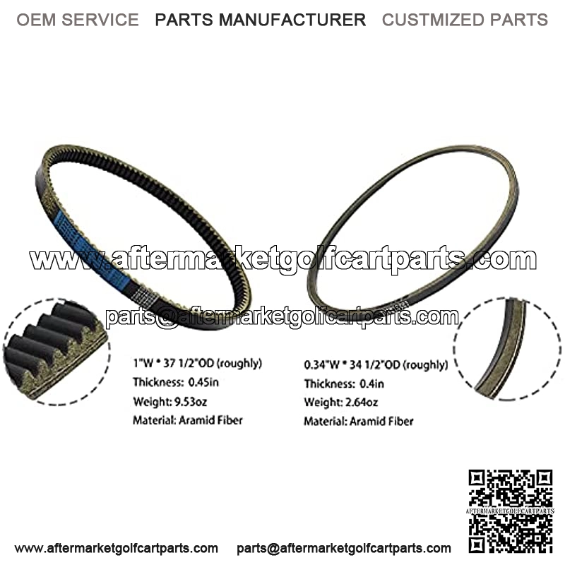 Correa de transmisie embrague de 1 1/8 pulgadas de ancho x 39 4/5 pulgadas de dimetro exterior (aprox.), repue OEM #J38-46241-00, J55-G6241-00;Correa de arranque/generador de 1/2 pulgadas de ancho x 35 pulgadas de dimetro exterior (aprox.), repue OEM #J38-81173-00, J55-H1173-00.Funcin: la correa del generador de arranque es responsable de que el motor se detenga durante los tiempos en que el vehculo estestaciorio, normalmente durante breves paradas en los semforos o ralentizacin. La correa del generador de arranque reinicia instantneente el motor para fines de aceleracin. bas son piezas importantes de carrito de golf YahaFibra de aramida de alto rendimiento. Como el material de la armadura corporal, la fibra de aramida puede proporcior resistencia a la tracci durabilidad, y todavantener la flexibilidad del cinturn.Atencin: no funciona en carritos de golf G3 y G29/Drive 2007-2011. Descripciel productoLos cinturones pueden secarse y desgarrarse con el tiempo y