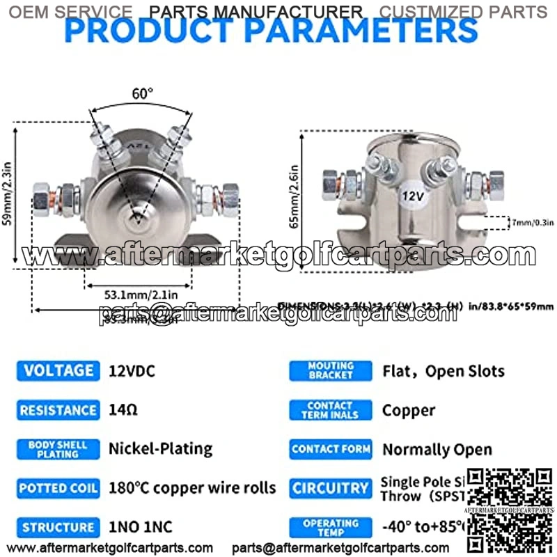 Max 300A Continuous Duty Solenoid Relay Nickel-Plating For Golf Carts, Winch, Marine In Rush 12VDC Resistance is 14apacity is 10.2W, Contacts:Normally Open (NO)/ 12VDC WITH 2 COPPER POINT Replaces:70-111224,3635820, 1114208, 1114218, 1114223, 1114534, 1114547/ Bracket:Straight;Spst, One circuit: Off – On, Bracket mounting:Holes 5/16 x 19/32 2-13/64 on center Our Coil Roll is using 180copper wire, Cover is Nickel-Plating, Meet Environmental Plating Requirment, And Avoid Rusting, Shining Max Transient current can be 300A, but Continuous Working Current recommend under 150 Amp/ WARRANTY: 90days Warranty and Free Return and Full Refund Note: Normally Make 80A as Working Current, Need Break 5 sec on, 50 min off