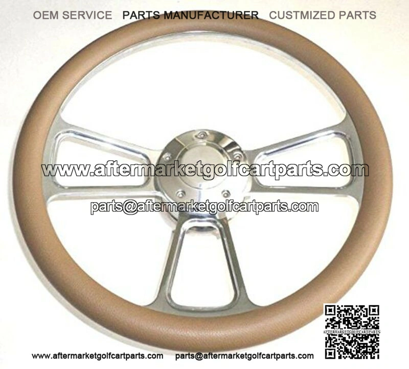 14″ Billet Aluminum with Tan Half Wrap Steering Wheel for Golf Carts Includes Horn and Adapter Part: 1098F-TAN-ET56P Behind The Wheel Features Smooth Finger Grooves For Added Grip Sleek Design! – Dimensions (approx): 3.5″ OD x 2.25″ Tall – Dish Depth of approx. 2″ – Polished Horn Button w/ Installation Wires – Full Billet One Piece Installation AdapterThis Kit will fit: EZGO Golf Carts (ALL) Club Car (1983 and prior) Bombardier Golf Carts GEM Golf Carts Harley Davidson (thru 1982) Columbia Par Cars (1982 and prior) Artic Cat Prowler Polaris Ranger (1998 and onwards) Polaris RZR (2008 and onwards) E-merge and Anvil (2005 and onwards)