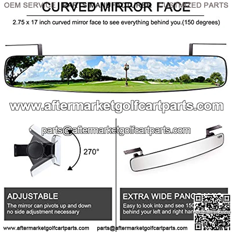 Golf Cart Rear View Mirror: Size-2.75″ x 16.5″ mirror face, Curved to see everything behind you, 16.5″ Extra Wide 150 degrees panoramic golf cart rear view mirror. Easy to installed, with two provided self tapping screws. PLEASE MAKE SURE THAT YOU HAVE A SUITABLE SURFACE TO MOUNT TOO (i.e. metal crossbar).