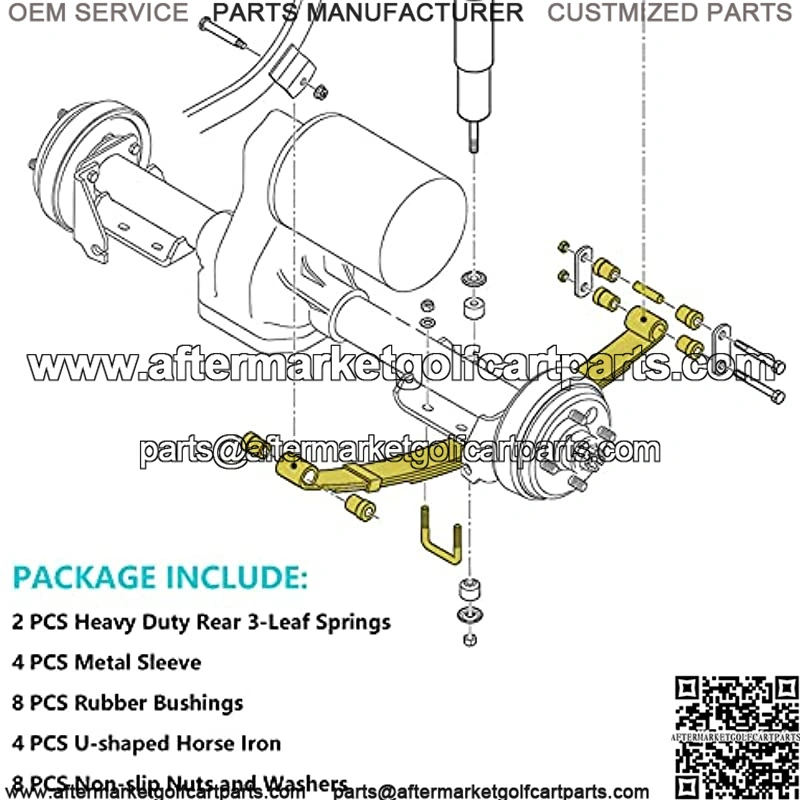The leaf spring bushings kit for EZGO TXT includes: Includes (8) Rubber (Not Imitation) Bushings & (4) Stainless Sleeves, (2)Heavy Duty Rear 3-Leaf Springs, 4 U-shaped horse iron.