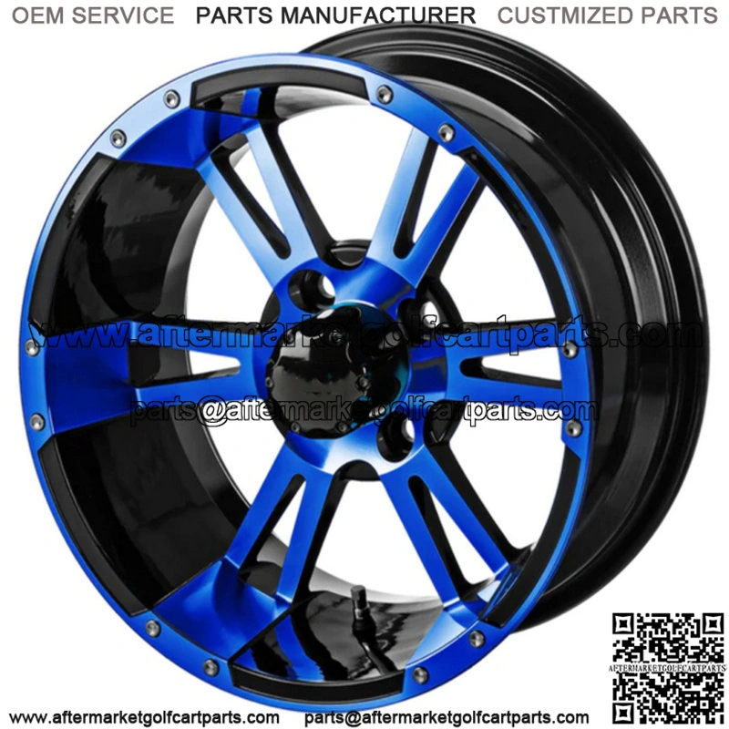 12″ Raptor Golf Cart Wheels Wheel Finishes: Black/Blue . Center Cap included Wheel Dimensions: 12X7 with 4×4 bolt pattern and 3+4 offset Lug Nuts sold separately