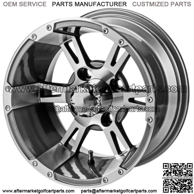 12″ Raptor Golf Cart Wheels Wheel Finishes: Gun Metal Gray/Machined. Center Cap included Wheel Dimensions: 12X7 with 4×4 bolt pattern and 3+4 offset Lug Nuts sold separately