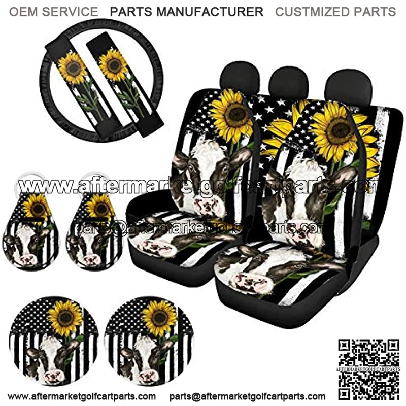Sunflower Cow Car Seat Covers Full Set for Women Men with Steering Wheel Covers Pad Coaster Front Rear Back Bench Seatcover Protection Automotive Accessories Combo Kit Universal Fit Decor