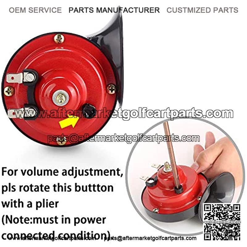Super loud electric horns, loud enough to get people’s attention adjustable volume control setting (the black button on backside is for volume control could adjust it when power connected)
